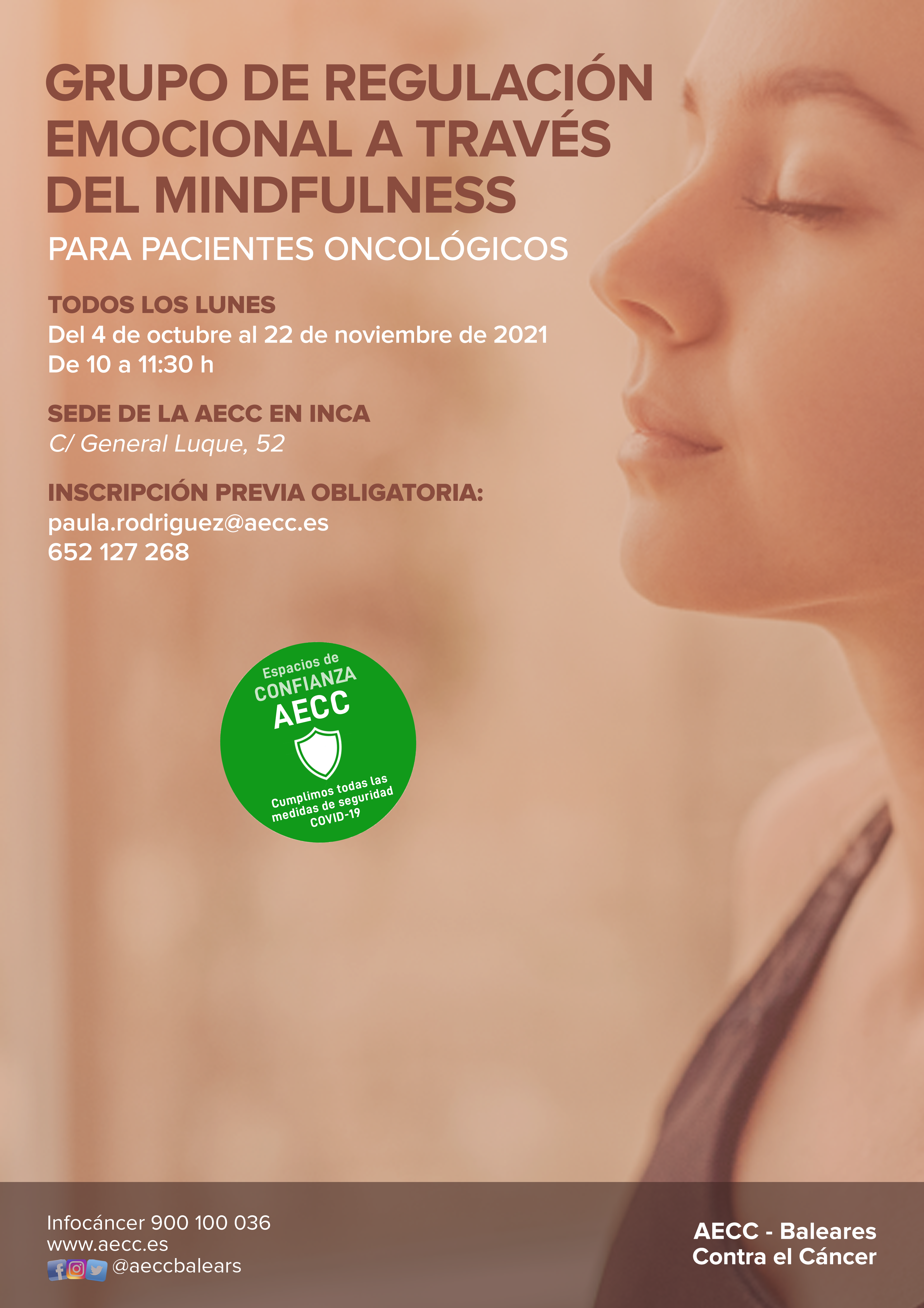 Todos los lunes, del 4 de octubre al 22 de noviembre, de 10:00 a 11:30 horas. En la sede AECC de Inca (c/ General Luque, 52)